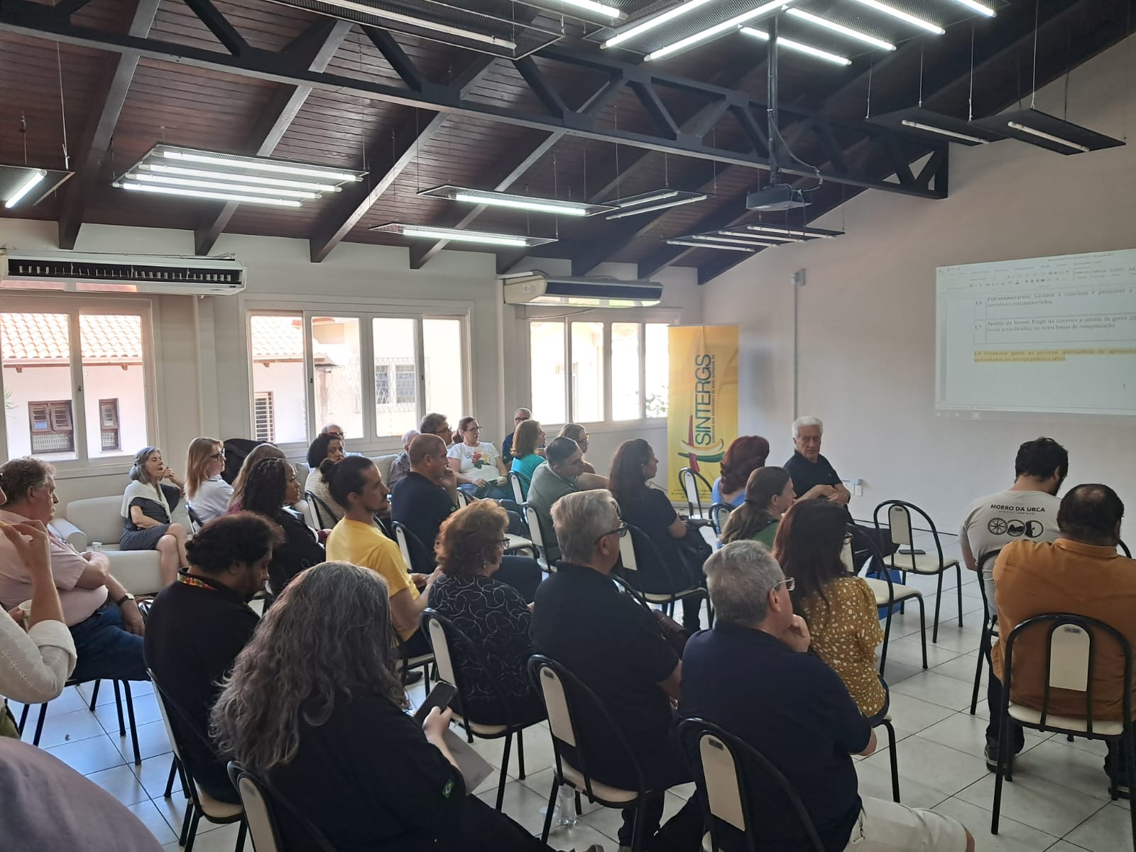 O Sintergs realizou, nesta terça-feira (18/11), sua Assembleia Geral Ordinária (AGO), na sede do sindicato, no bairro Menino Deus, em Porto Alegre. Todos os itens da pauta, incluindo a previsão orçamentária, o Plano de Trabalho Estratégico 2026, o conjunto de reivindicações prioritárias e o relatório das atividades sociais, foram aprovados pelos associados presentes.