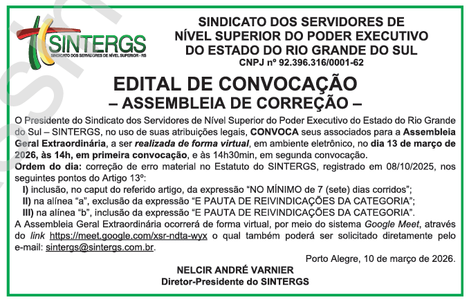 A assembleia ocorrerá às 14h, em primeira convocação, e às 14h30, em segunda convocação, e terá como pauta a correção de erro material no Estatuto do Sintergs, registrado em **8 de outubro de 2025.